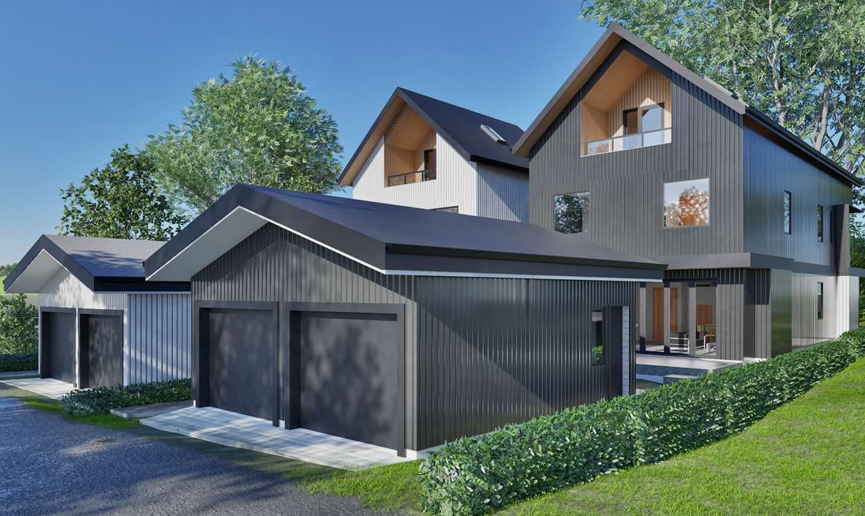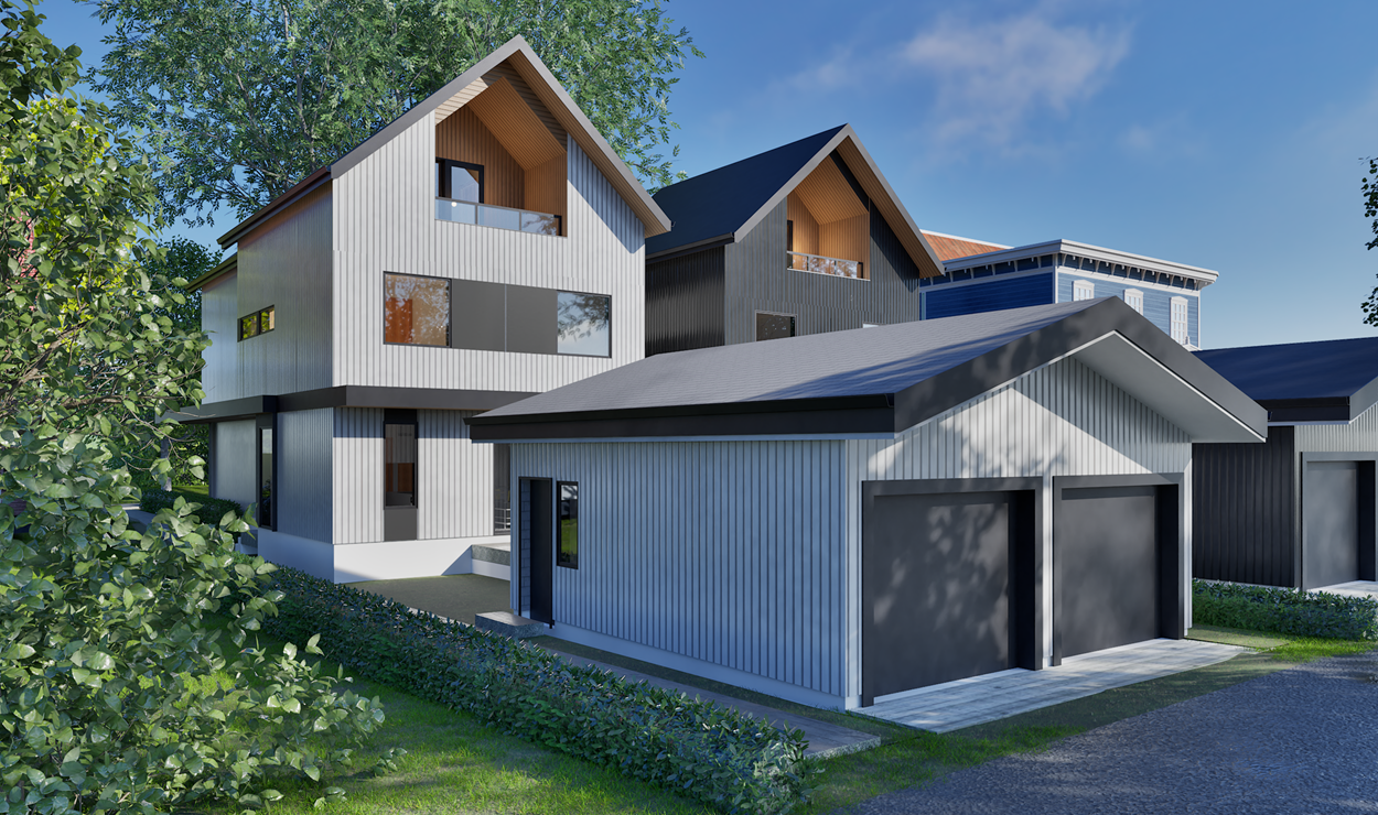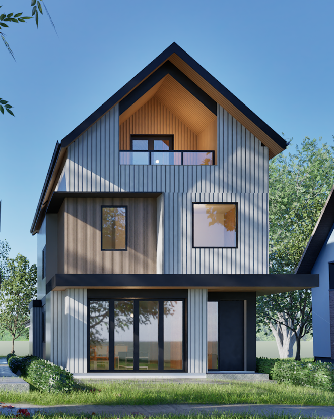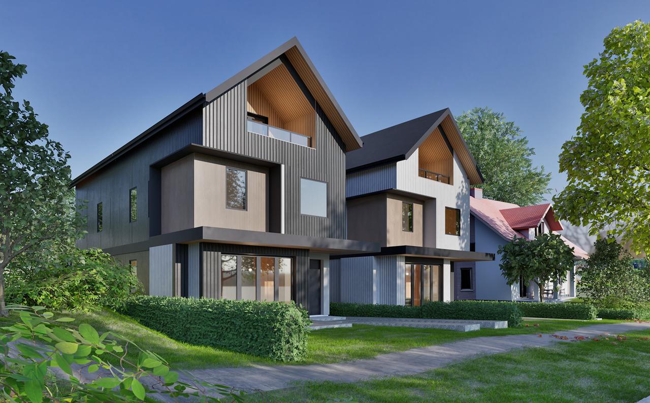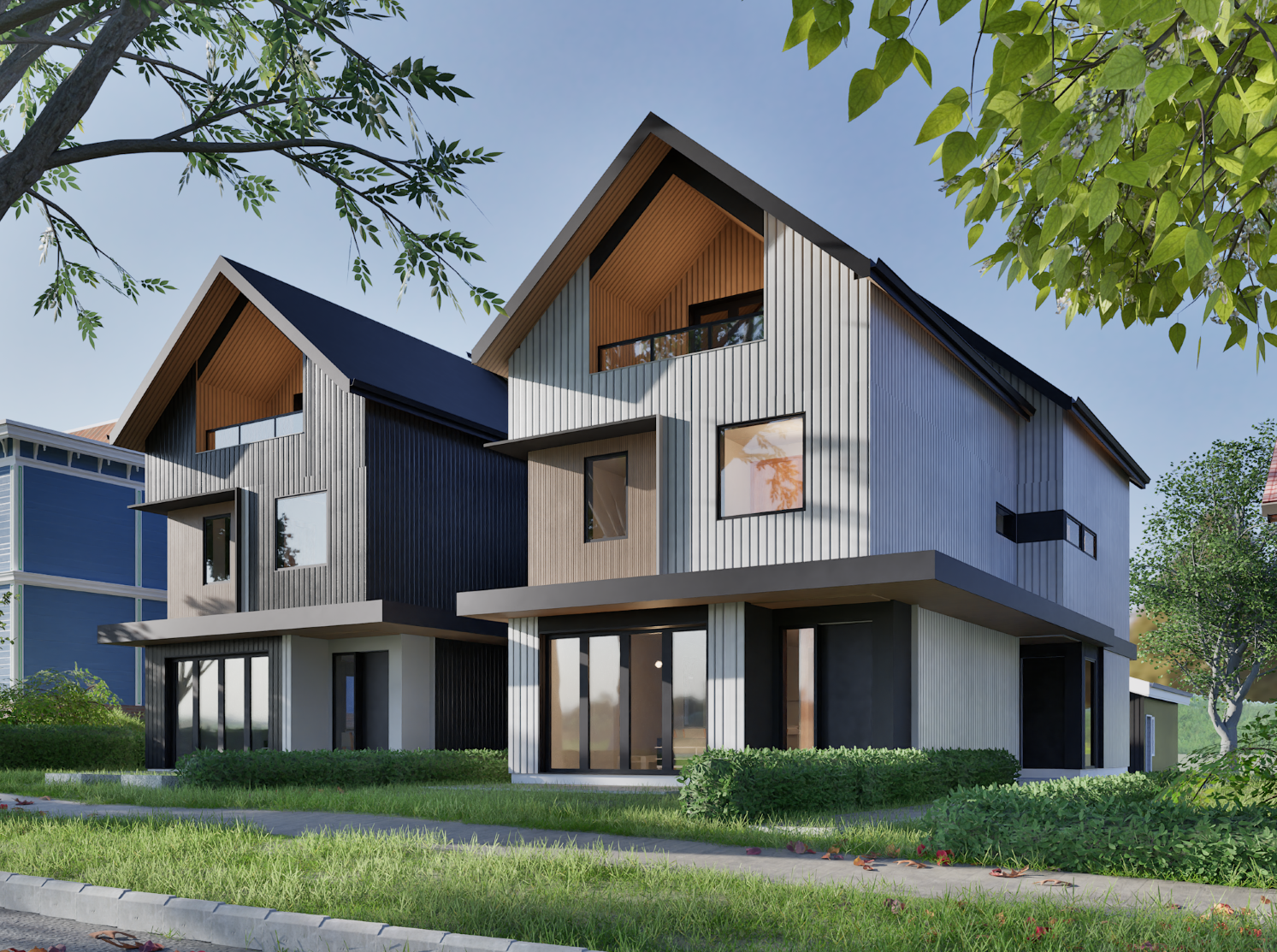Each side of the duplex is designed to feel like a standalone home, with generous glazing, vaulted ceilings, and thoughtfully zoned interiors. The warm wood soffits and gabled rooflines add a touch of West Coast charm, while the recessed entries and overhangs enhance both privacy and curb appeal.